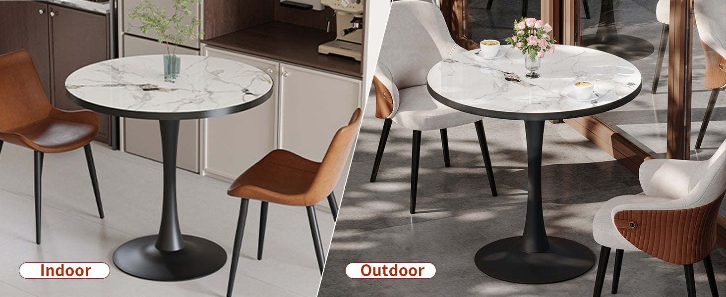 【80cm Tall & Pedestal Base】This sintered stone table functions not only as a dining table for everyday meals, also doubles as leisure coffee table, ideal for relaxed seating in offices, break rooms, or casual meeting areas, standing at height of a 80cm, it pairs well most standard dining chairs (seat height 45–50 cm), ensuring comfortable seating for adults, designed with an enlarger pedestal base, providing reinforced support and prevents tipping over, the base is finished with electroplated spray coating that resists fading, deformation and rust, adding a refined, modern touch to overall design