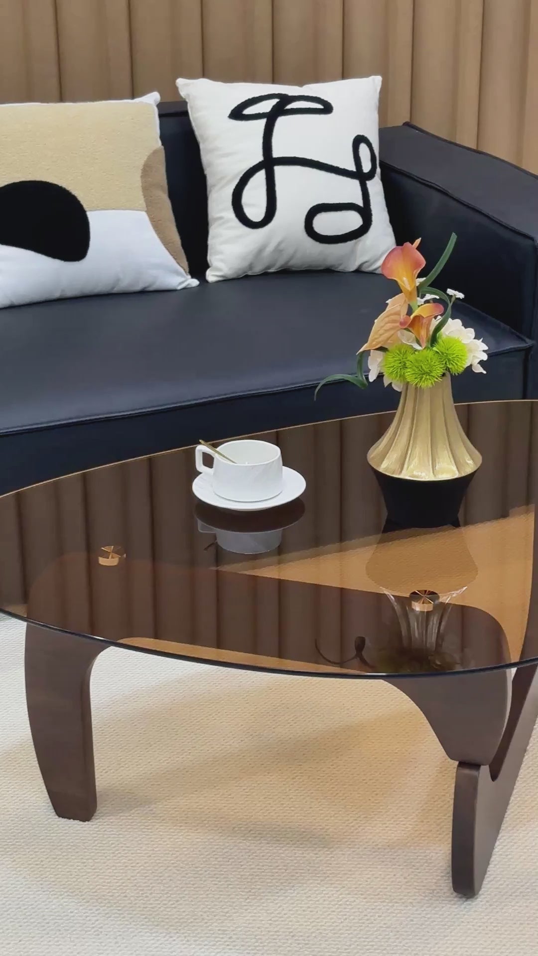 【Versatile Furniture】This versatile piece of furniture showcases a harmonious fusion of warm amber-tinted tempered glass top with sculptural rubber wood base together create a harmonious, inviting presence and draws eyes, the tempered glass is 4 times stronger than a regular glass, it undergoes a special heat-treatment process that more resistant to pressure, impact, while crafted with curved, interlocking wooden legs in a walnut color finish that provide strong stability, contributing to the visual intrigue